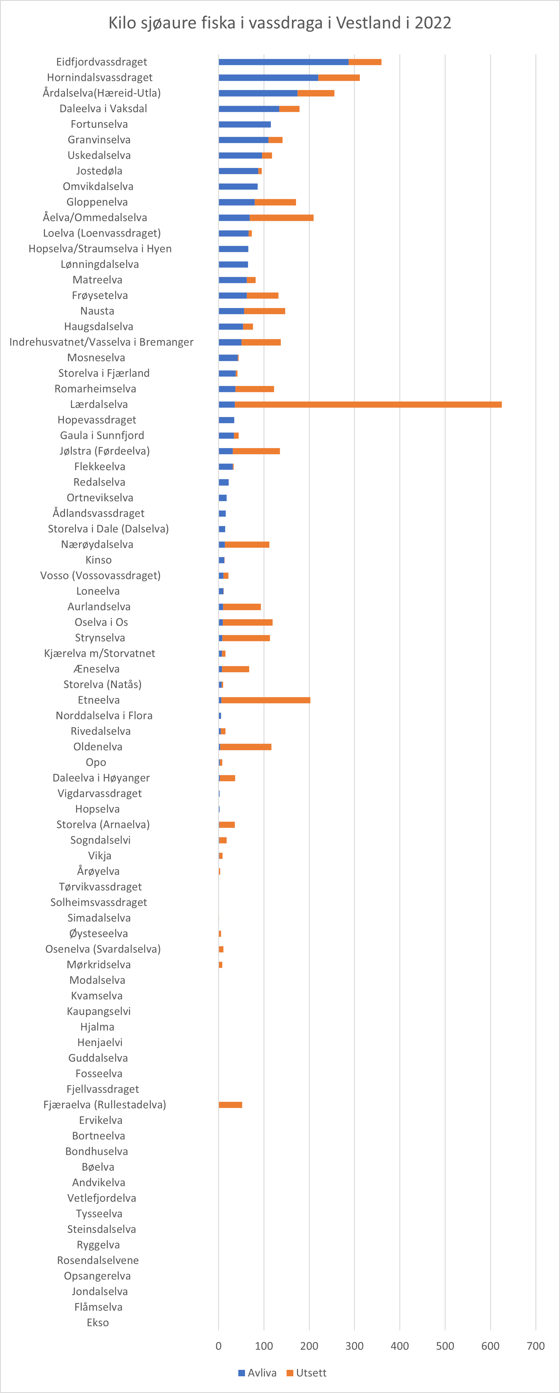 I sesongen 2022 vart det fiska totalt 35 701 kg laks og 5 138 kg sjøaure, i elv og sjø i Vestland. Av dette var 2 782 kg laksefisk tatt i sjølaksefisket.